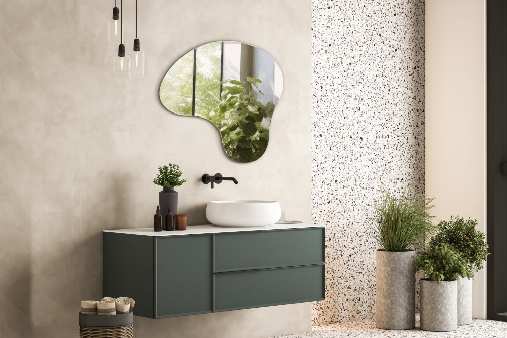 Pokud vám záleží na odvážném efektu, zrcadlo do koupelny může mít také netradiční tvar – například asymetrický nebo organický, což může prostoru dodat výjimečný a designérský výraz.